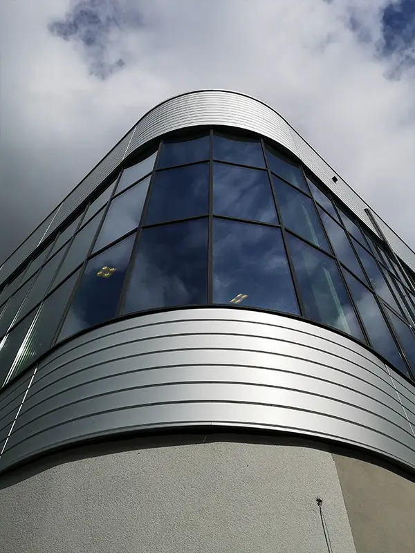 Die Fassadenpaneele konnten durch unser Fassadensystem favis schnell und kosteneffizient montiert werden. Die gerundeten Gebäudeecke sind das offensichtliche Highlight dieser Fassade. Aus unserer eigenen Fertigung haben wir mit Fassadenpaneelen aus 2,0 mm bandeloxierten Aluminiumblech die ideale Lösung anbieten können. Die Fassadenpaneele wurden durch Kanten hergestellt, damit konnte die Ansichtsbreite der Fassadenpaneele individuell angepasst werden und auch unterschiedliche Fensterhöhen bei der Ausführung ohne größeren Aufwand berücksichtigt werden. Die Verblechungsarbeiten an Fenstern und Attika wurden in eigener Fertigung hergestellt.