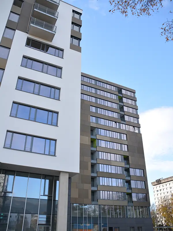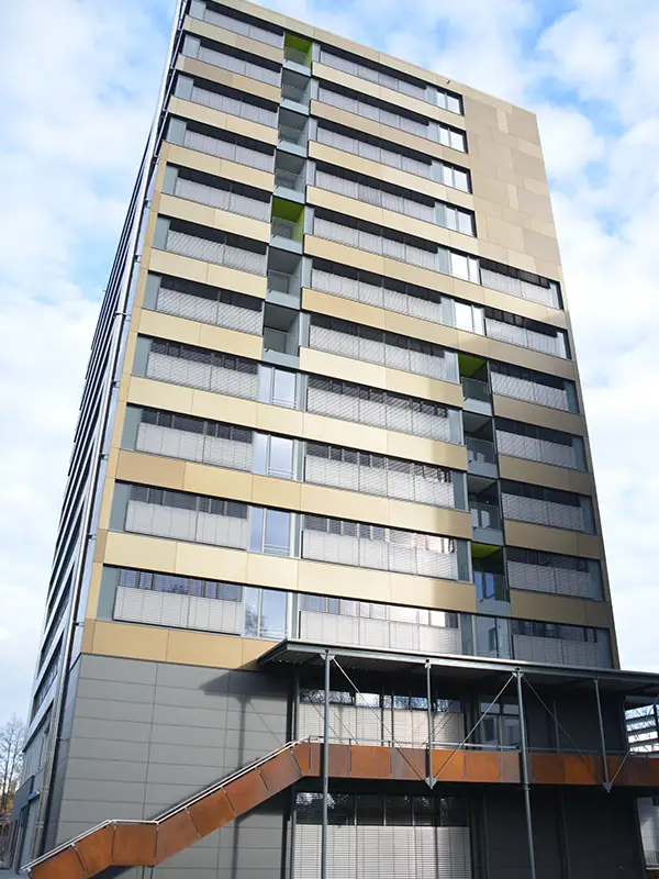 Für die Realisierung moderner und ästhetischer Metallfassaden setzen wir auf eine innovative Unterkonstruktion mit Agraffen-Befestigung, die eine völlig verdeckte Montage der Fassadenelemente ermöglicht. Unsere hochwertigen Aluminiumtafeln werden präzise im Wasserstrahlverfahren zugeschnitten und anschließend mit rückseitigen Schweißbolzen ausgestattet, um die Agraffen-Profile sicher und unsichtbar zu befestigen. Durch das spezielle Eloxalverfahren erhalten die Aluminiumtafeln eine edle, natürliche Oberfläche, die nicht nur optisch überzeugt, sondern auch besonders widerstandsfähig ist. Sämtliche Verblechungsarbeiten an Fenstern und Attika fertigen wir in unserem eigenen Werk, um höchste Qualität und eine perfekte Abstimmung auf jedes Bauvorhaben zu gewährleisten.