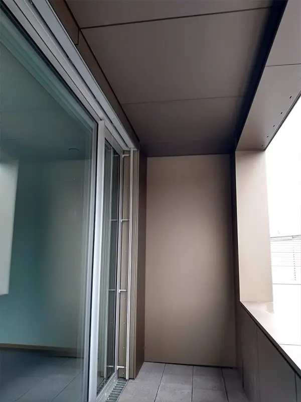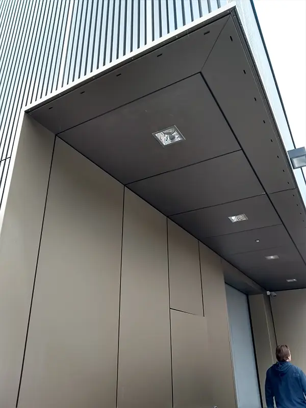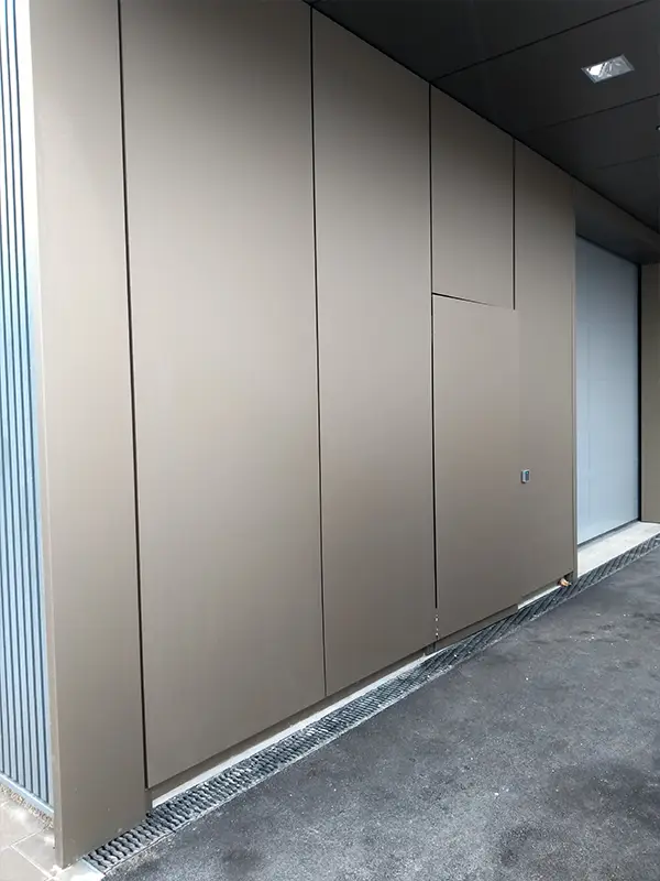Für das Übungszentrum in Regensburg wurde eine speziell entwickelte, horizontal ausgerichtete Unterkonstruktion eingesetzt, die zur optimalen Aufnahme der Fassadenelemente dient. Die Fassadenelemente selbst bestehen aus eigens für dieses Projekt gefertigten Strangpressprofilen aus Aluminium, die durch eine stabile Nietverbindung sicher auf der Unterkonstruktion befestigt wurden. Um eine präzise und passgenaue Montage zu gewährleisten, wurden die Profile maßgenau zugeschnitten und anschließend mit einer hochwertigen Pulverbeschichtung in einem dunkelgrauen NCS-Farbton veredelt. Für besondere Farbakzente an der Fassade sorgen gekantete Aufsatzelemente, die auf die Strangpressprofile aufgebracht wurden. Darüber hinaus erfolgten sämtliche Verblechungsarbeiten an Fenstern und Attika in eigener Fertigung, was einen hohen Qualitätsstandard und eine exakte Ausführung garantiert.